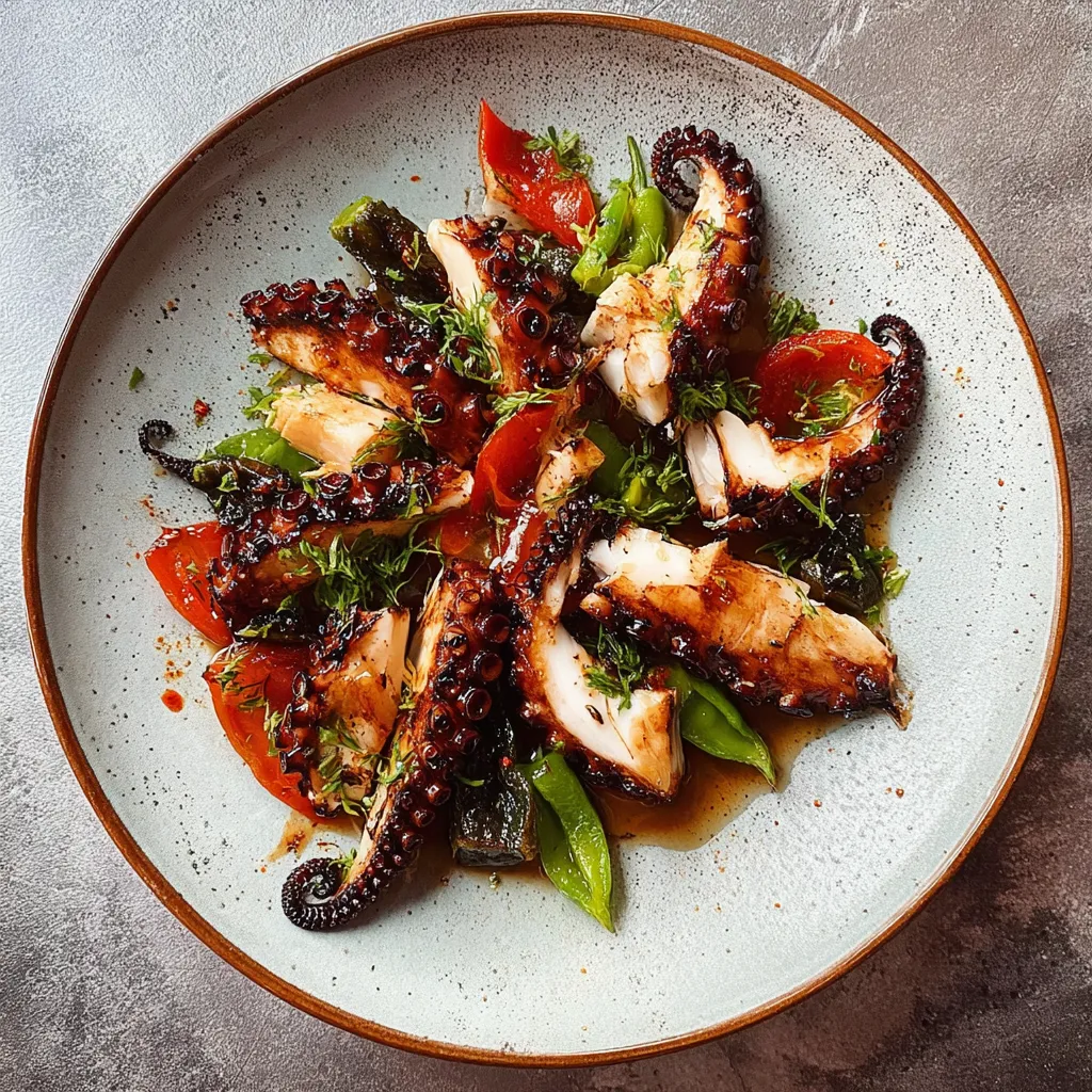 Malse gegrilde octopus met een rokerige salsa van puntpaprika, Padrón-pepertjes en tomaat. Afgewerkt met chililolie, grof zout en frisse limoenrasp. Een verfijnd gerecht dat perfect past bij een zomerse barbecue.